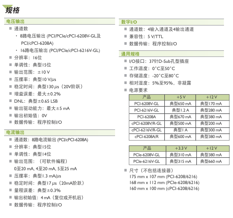PCI-6208V-GL:8通道16位電壓模擬輸出卡 PCI-6216V-GL:16通道16位電壓模擬輸出卡 PCI-6208A:8通道16位電壓電流模擬輸出卡 |